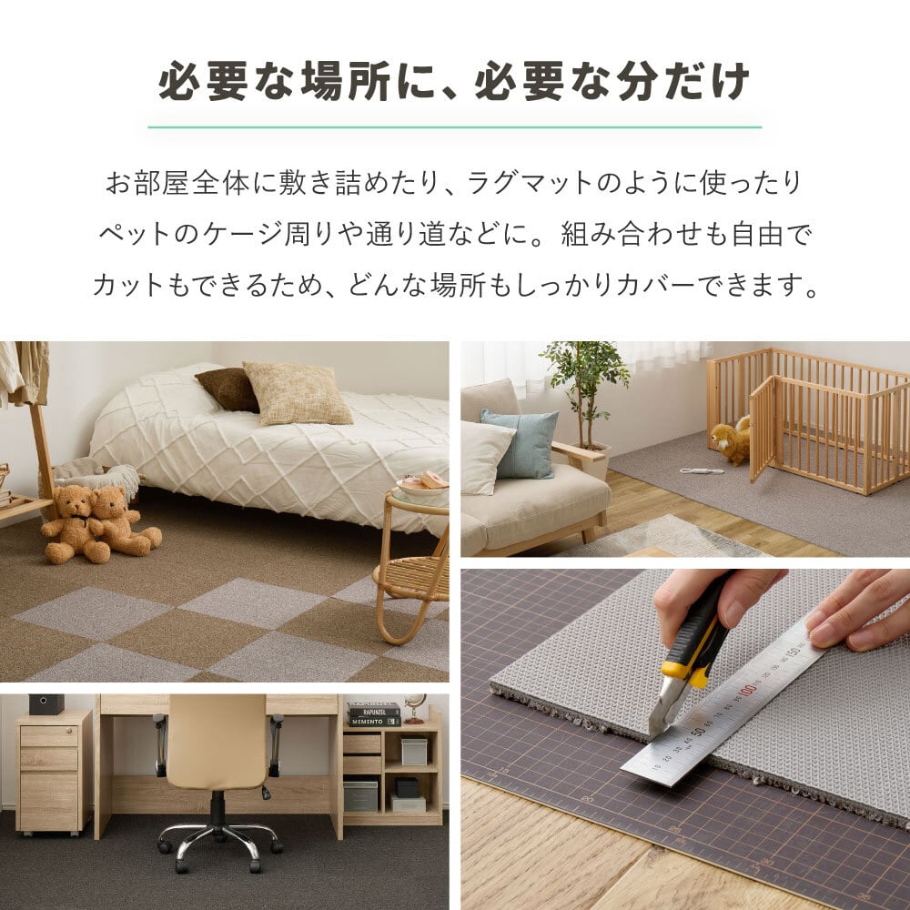 カット調整もでき、ケージ周りや通り道にも使いやすく、必要な場所に、必要な分だけ敷いて使えるタイルカーペットです。