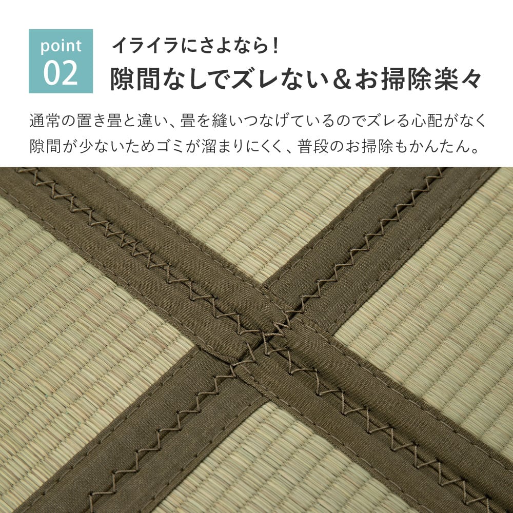 ズレるイライラから解放!置き畳同士を繋ぎ合わせたから隙間にゴミが溜まりにくく、コンパクトに折りたためるから収納も掃除もらくらく。使いたいとき、パッと広げるだけで簡単に畳スペースがつくれます。綿の約10倍の吸放湿性をもつ、天然のクーラー「い草」で節電対策にも。